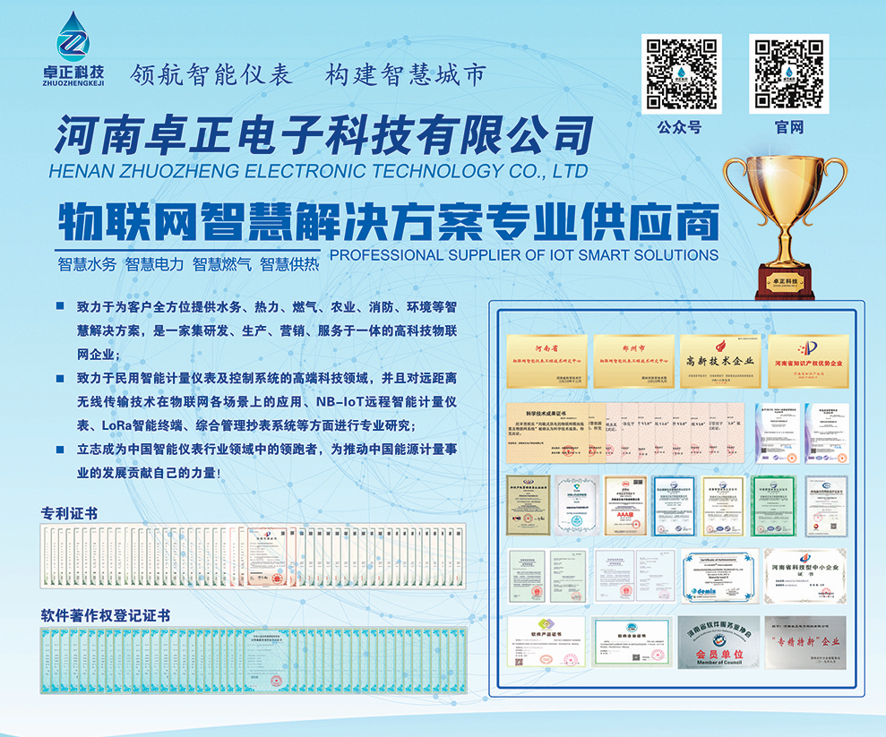 河南卓正電子科技有限公司,專業的物聯網表應用方案提供商,擁有一支多名博士、碩士組成的核心研發團隊,率先將NB-IoT、LoRa遠傳技術、智能閥控技術應用于水務、熱力、燃氣、農業、消防、環境領域,以“領航智能儀表 構建智慧城市”為企業使命,立志成為中國智能儀表行業領域中的領跑者,為推動中國能源計量事業的發展貢獻自己的力量!